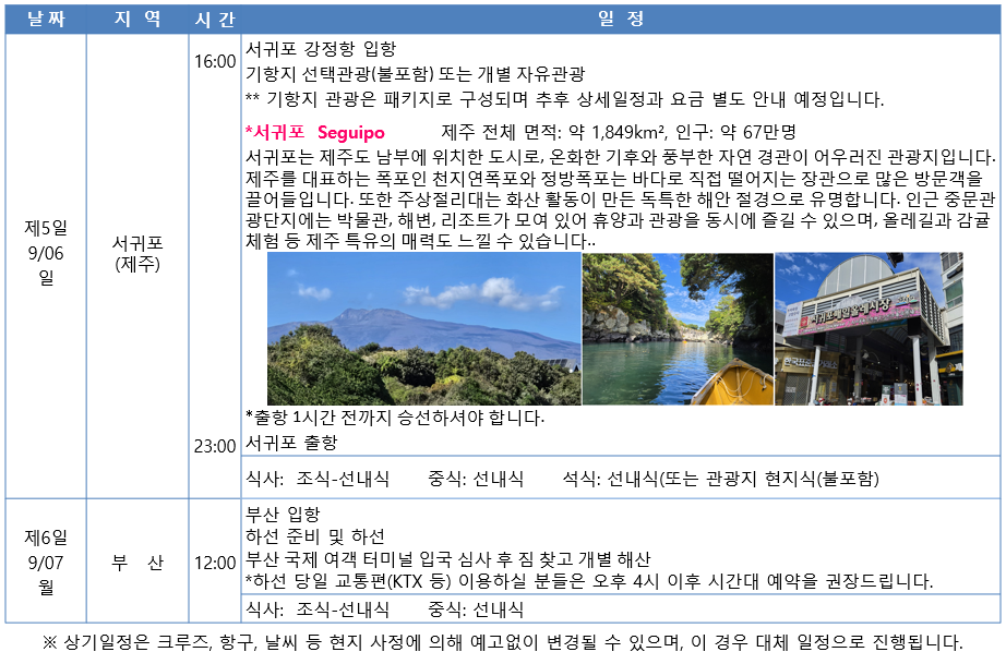 * 여행일정은 기상 및 선사와 현지 사정으로 인해 변경될 수 있습니다.
